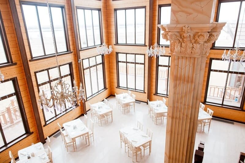 - Хорошей вместительностью. Можно организовать корпоративный банкет, отметить профессиональный праздник. Уютно посидеть с большой компанией или провести выездной семинар. Для любой вашей ситуации подберут нужный зал.